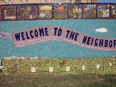 Please bear in mind that the pictures below are just a fraction of what's on The Wall. There are countless intricate, tiny, amazing little pieces of personal art and memories. Click on each image to enlarge. BTW, the out-of-place-looking round wooden circles hold places that will be filled with (I think) text with neighborhood history and stories...